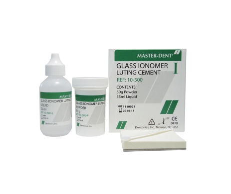 Master-Dent® stiklo jonomerinis cementas. 15g miltelių + 15ml skysčio arba 100g miltelių + 60ml skysčio