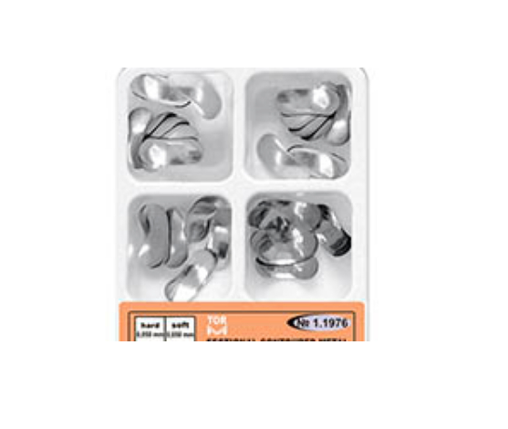 Sekcijinės kontūrinės metalinės matricos N 1.1976 (M / rinkinys). 4 tipai: 0,05 mm – kietos, 0,035 mm – kietos, 0,05 mm – minkštos, 0,035 mm – minkštos (mikronai) storio. 30 vnt.: abiejų storių kietų po 10 vnt., abiejų storių minkštų – po 5 vnt.