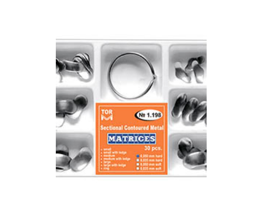 Sekcijinės kontūrinės matricos N 1.198 (rinkinys su žiedu). 4 tipai: 0,05 mm – kietos, 0,035 mm – kietos, 0,05 mm – minkštos, 0,035 mm – minkštos (mikronai) storio. 30 vnt.: N 1.0971 – 3 vnt., N 1.0972 – 10 vnt., N 1.0973 – 5 vnt., N 1.0974 – 3 vnt., N 1.0975 – 4 vnt., N 1.0976 – 5 vnt. + žiedas